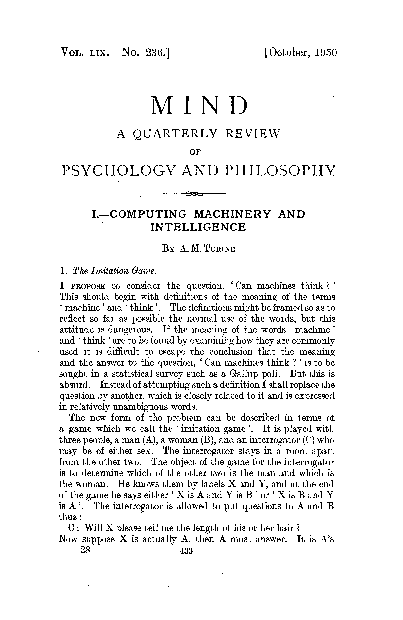 Turing's Computing machinery and intelligence first page —