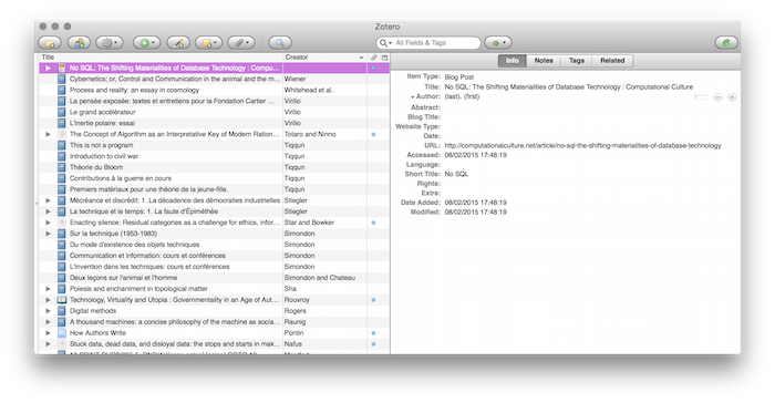 Zotero brands itself as a "research organiser", meaning that it can collect and arrange academic research information under a simple interface. As you can see from the above image, in a nutshell, Zotero is a list of works (books, blog posts, chapters, journal articles, etc.) augmented with meta-data (notes, tags, relations, etc.). Each work has, of course, a formal description adequate to the type of work it represents. For example, a blog post has an URL while a journal article may have a volume identifier. The goal here is not to delve into the details of each formats relating to each types of work that can be represented in Zotero, but rather to make use of it and see how it proceeds in formalising types of work.