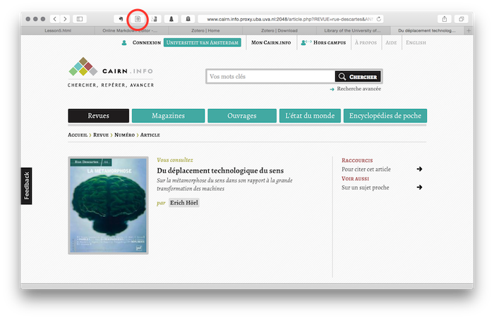 When you installed the standalone version of Zotero, an extension (plug-in) for your web browser was also available to install. Using this plug-in on your browser helps you collect bibliographical items on the web. Depending on your type of browser (Safari, Chrome, Firefox) you should see a small Zotero icon near your address bar. When an web page presents an bibliographical item that can be added to Zotero, the icon will change aspect (or literately appear) signifying that when clicked, the item will automatically be inserted in Zotero's database. This comes very handy when browsing journals' websites for example. Adding an article to Zotero becomes very easy (as exemplified in the image above).